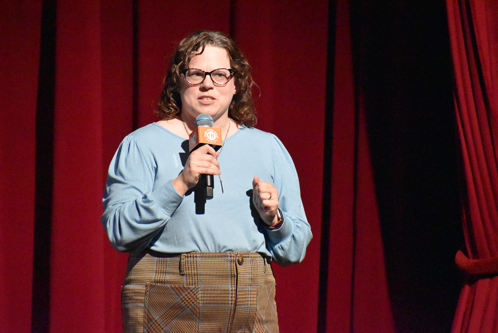 Karen Fenaroli, founder of the Pure Pitch Rally, speaks during the 2025 event at the Nelson-Atkins Museum of Art; photo by Taylor Wilmore, Startland News