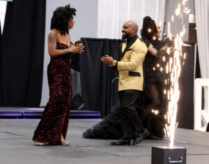 Brandon Calloway, co-founder and CEO of KC GIFT, congratulates Tanyech Yarbrough after Wah Gwan Afro Caribbean restaurant was announced as the winner of the nonprofit’s $100,000 grant during KC GIFT’s annual gala; photo courtesy of KC GIFT