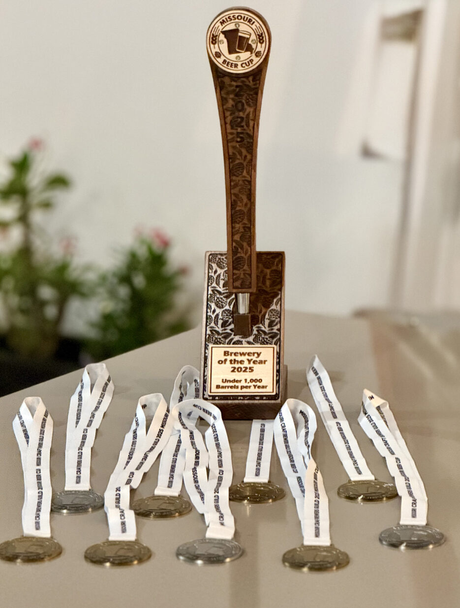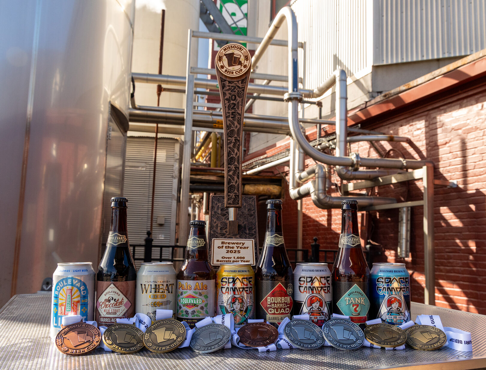 Missouri Beer Cup medals and “Brewery of the Year” trophy for Boulevard Brewing Co.; photo courtesy of Boulevard Brewing Co.