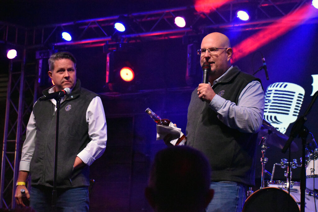 Greg Koehler and Greg Kratofil, GK2, speak on stage at Starty Party at Knuckleheads; photo by Taylor Wilmore, Startland News