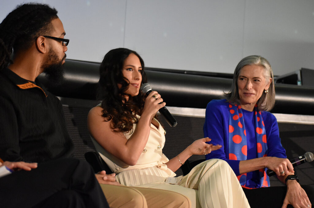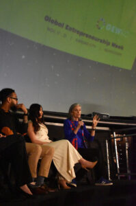 Dulcinea Herrera, Café Corazón, center, speaks alongside Alan Kneeland, The Combine KC, and Tracy Whelpley, KC2026, during a GEWKC panel on World Cup preparations for small businesses; photo by Tommy Felts, Startland News
