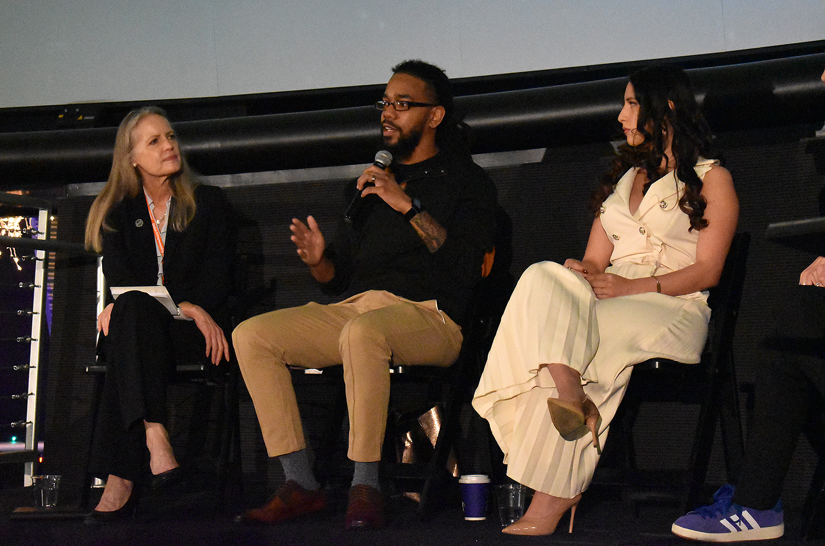 Alan Kneeland, The Combine KC, center, speaks during a panel conversation in the Planetarium at Union Station during GEWKC; photo by Tommy Felts, Startland News