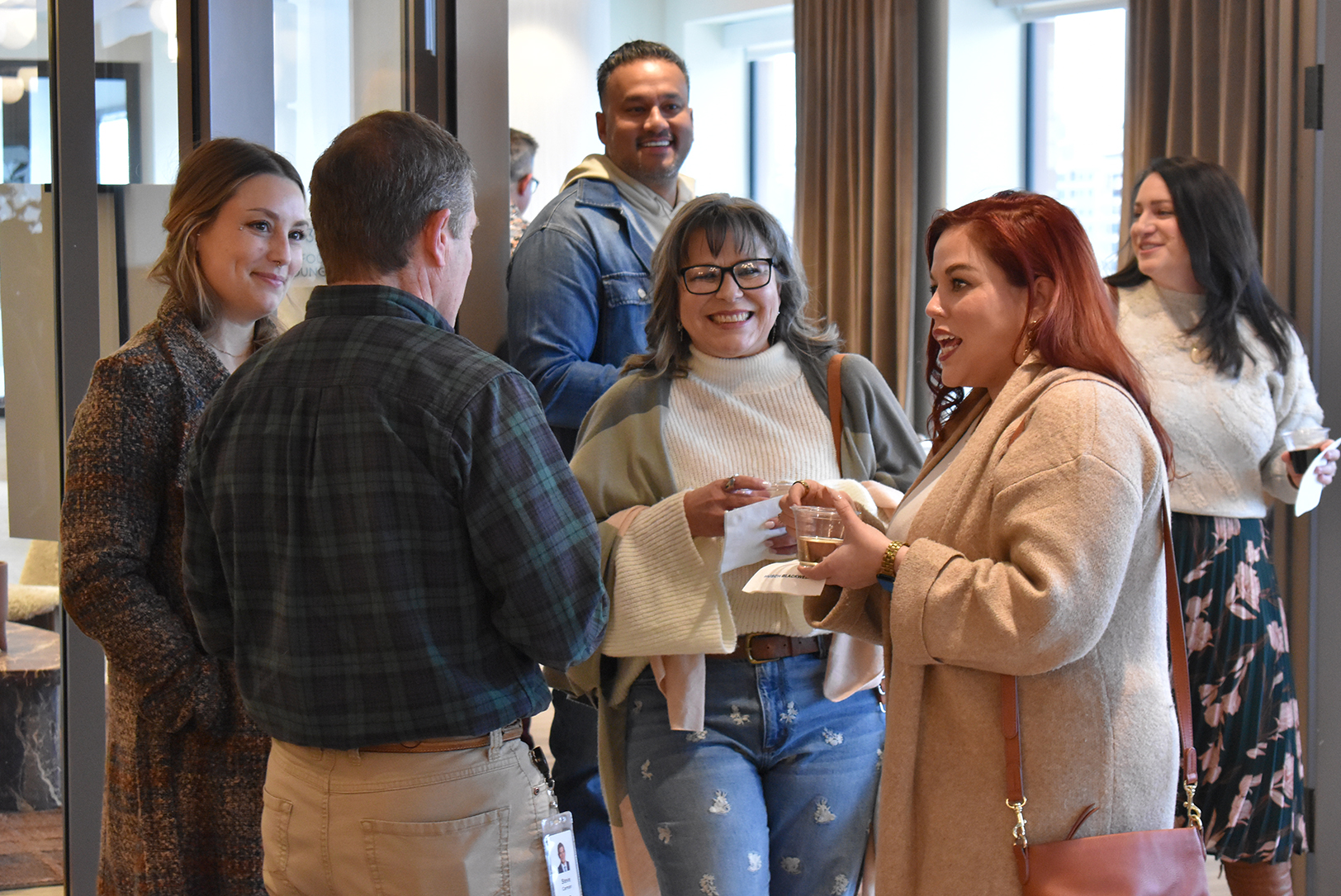 Startup community members chat during the awards reception for Startland News’ Kansas City Startups to Watch in 2026 at Husch Blackwell’s headquarters on the Country Club Plaza; photo by Austin Barnes, Startland News