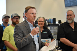 Dan Foltz, founder and president of KBS Constructors Inc., gives remarks during a ribbon-cutting event for the Link Innovation Labs project in Topeka; photo by Taylor Wilmore, Startland News