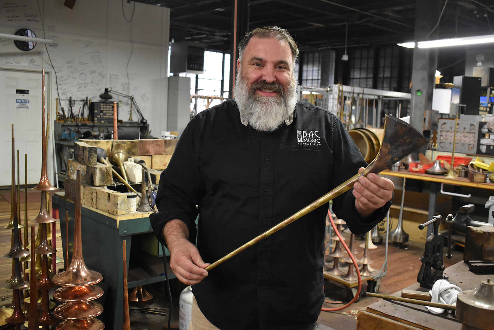 Across the historic intersection at Kansas City’s 12th and Vine streets, B.A.C. Musical Instruments operates as one of the few remaining American factories handcrafting professional brass instruments. “This is where all the musicians would hang out back in the day,” said founder Mike “Horn Doctor” Corrigan, gesturing toward the Paseo sunken garden beside his shop.
