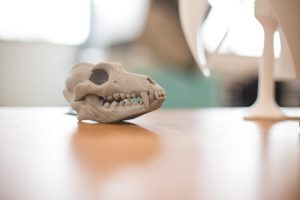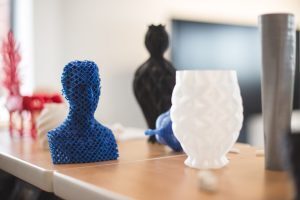 Walking through the studio reveals a cornucopia of creativity. With symphony beeping machines to offer a score, students mingle amid rows of 3-D printed animal skulls and icons like Nefertiti and the Eiffel Tower. As one student digitally drafts a teapot lid, another uploads a table design that’s being cut via laser. Black and white tapestries rest atop the hulking digital loom while an instructor challenges a student to tweak the dimensions of a project.