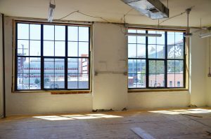 Warm sunlight bathes a future ceramics shop. A vintage Thomas Cusack Co. mural advertisement peeks from behind the plaster wall of an in-the-works photography space. Views from the second and third floors reveal a city skyline in creative transition.