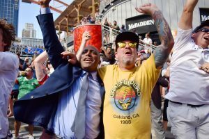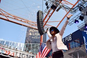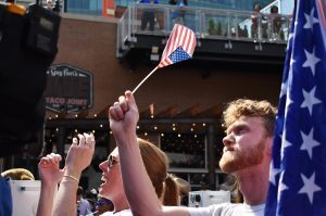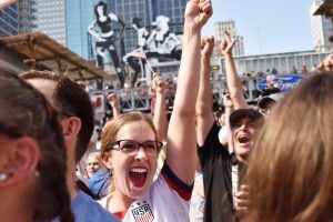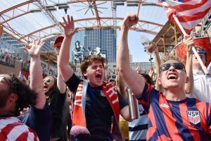 Fans react Thursday at Power & Light as news breaks that Kansas City will host during the 2026 World Cup; photos by Channa Steinmetz/Startland News