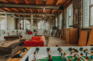 The spaces are dominated by large windows with cascading natural light, original artwork by Kansas City’s Warren Harvey, graffiti reminders of the buildings’ abandoned days, and contemporary furniture mixed with 2000 Vine’s uniquely vintage architecture. Shimmering gold designs on the exterior of the south building tease the headline-grabbing ventures to come.