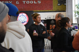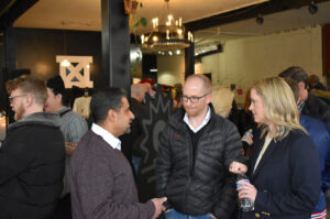 Randy Wasinger, Mary Wasigner, and Ryan Wasinger, of CryptoSlam, talk with Dough Adams, Morgan Stanley, during Startland News’ Kansas City Startups to Watch in 2023 reception at MADE MOBB
