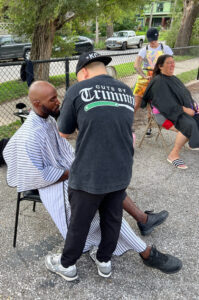 After Islow reached out, the team at MADE MOBB guided the students as they designed and screen printed T-shirts to sell at First Fridays to raise money for their project. The youth organized an event where they had food, drinks, hygiene packs, haircuts, and a place to kick around a soccer ball.