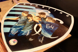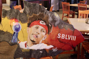 A painting by David Alston featuring Kansas City Chiefs’ Travis Kelce, Patrick Mahomes and Andy Reid; photo by Nikki Overfelt Chifalu, Startland News