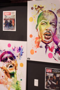 While his pieces don’t feature happy, little trees, David Alston’s pop culture-inspired portraits still reflect the influence of the iconic painter Bob Ross.