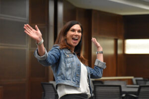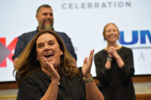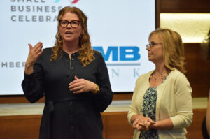 Joan Charbonneau, Perfect Promotions, reacts to the Top 10 announcement at UMB Bank during a KC Chamber Small Business Celebration reveal event; photo by Tommy Felts, Startland News