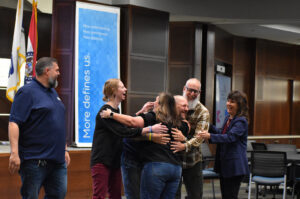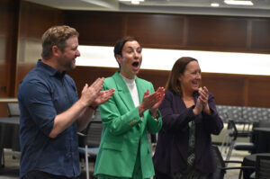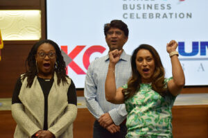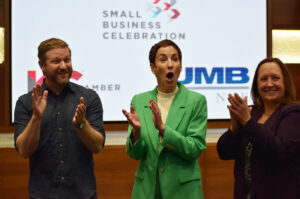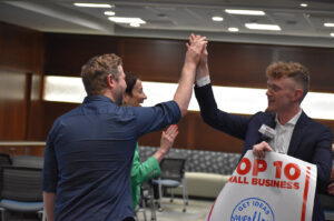 Leaders from SnapIT Solutions react to the Top 10 announcement at UMB Bank during a KC Chamber Small Business Celebration reveal event; photo by Tommy Felts, Startland News
