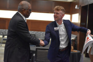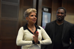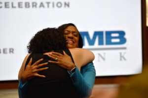 Sherry and Ken Lumpkins, Blue Symphony, react to the Top 10 announcement at UMB Bank during a KC Chamber Small Business Celebration reveal event; photo by Nikki Overfelt Chifalu, Startland News