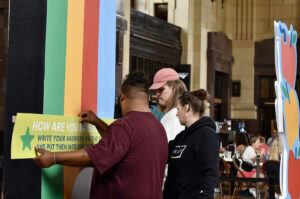 Michele Dawbarn, Collective EX, helps construct a large-scale rainbow as part of the RaisingKC display at Union Station; photo by Nikki Overfelt Chifalu, Startland News