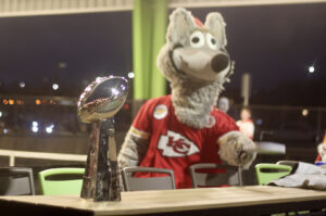 KC Wolf parades FOX News personality and former Kansan Steve Doocy through Chicken N Pickle’s Overland Park location; photo by Nikki Overfelt Chifalu, Startland News