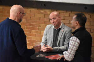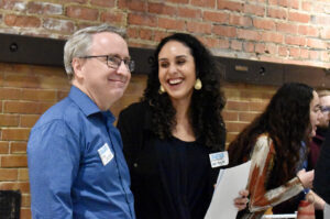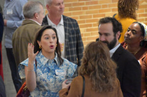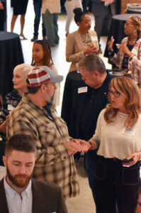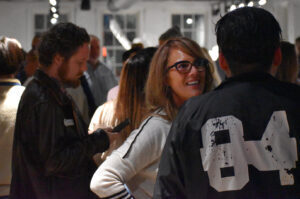Phil "Sike Style" Shafer, a muralist and art entrepreneur who founded Sike Style Industries, talks with fellow Small Business Superstars during a packed KC Chamber reception at the Zhou B. Art Center; photo by Tommy Felts, Startland News