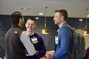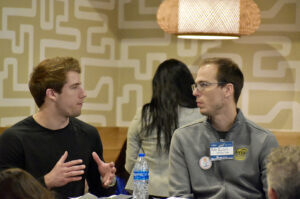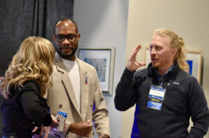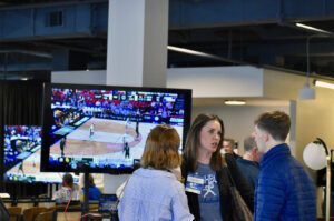 Gamechangers & Champions attendees participate in a basketball-themed lounge at the event, organized with a backdrop of the NCCA Mens Basketball Tournament in Wichita; photo by Nikki Overfelt Chifalu, Startland News