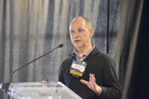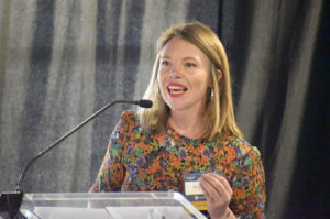 Mary Beth Jarvis, president and CEO of NXTUS, speaks during the Gamechangers & Champions summit; photo by Nikki Overfelt Chifalu, Startland News