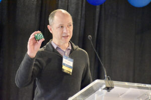 Earlier in the day at the Gamechangers & Champions competition — which took inspiration from the nearby NCAA basketball tournament — the “Innovative Eight” were revealed with each presenting a one-minute elevator pitch (complete with a shot clock) to the crowd. Then, venture capital fund managers coached the eight remaining competitors and narrowed the field to the Final Four. Those four delivered their full, five-minute pitches to a panel of judges.