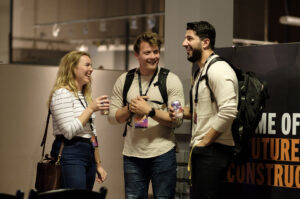 Jabbok Schlacks, co-founder of EquipmentShare, center right, networks at the 2024 Missouri Startup Weekend with Sandy Kemper, founder of C2FO; serial builder Riddhiman Das; Brett Calhoun, general partner at Redbud VC; and others before judging for the Startup Weekend final pitches; photo courtesy of Missouri Startup Weekend