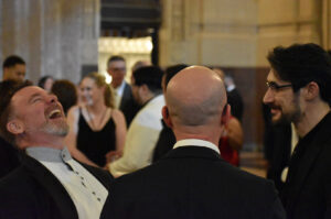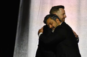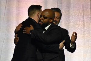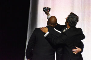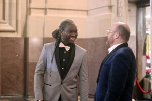 Nic Bianchi, a 2023 Pipeline fellow, fist-bumps serial entrepreneur and longtime Pipeline Entrepreneur Toby Rush after winning the 2023 Innovator of the Year award at the 2025 Pipeline Innovators Gala at Union Station; photo by Nikki Overfelt Chifalu, Startland News