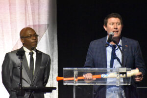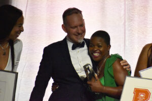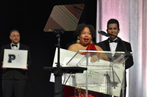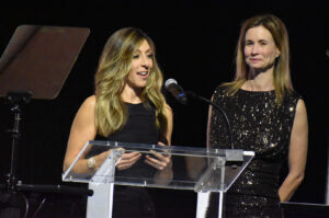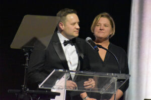 Melissa Vincent, CEO at Pipeline Entrepreneurs, stands on stage alongside serial founder and Pipeline Entrepreneur Donald Hawkins at the 2025 Pipeline Innovators gala; photo by Nikki Overfelt Chifalu, Startland News