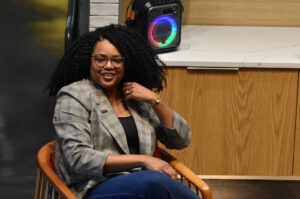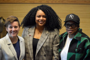 Jannae Gammage, Cyphr, right, speaks alongside Shervonne Cherry, Spark Coworking, and Conner Hazelrigg, Hilltop Technologies, at the “Inspiring Women Live!” fireside chat at Spark Coworking Kansas City, an event in partnership with LaunchKC; photo by Nikki Overfelt Chifalu, Startland News