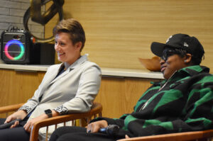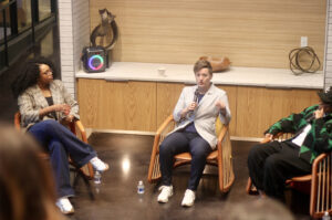 Conner Hazelrigg, Hilltop Technologies, right, speaks alongside Shervonne Cherry, Spark Coworking, during the “Inspiring Women Live!” fireside chat at Spark Coworking Kansas City; photo by Taylor Wilmore, Startland News