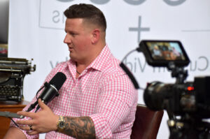 So for his first KC Chamber Small Business Celebration Candidates’ Showcase, Moss and his team from Moss Marketing Group set up a podcast studio — complete with a mini suit of armor — to interview fellow founders, including Alex Reed with Noonan and Jasmine Nastasi with Stellar Image Studios.