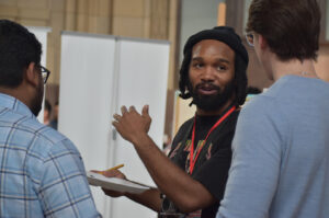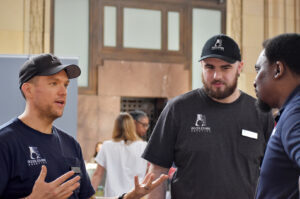 Rickey Leathers, Savvy Salon, center, chats with Alex Reed, Noonan and GolfTRK, during the KC Chamber's showcase for small businesses at Union Station; photo by Nikki Overfelt Chifalu, Startland News