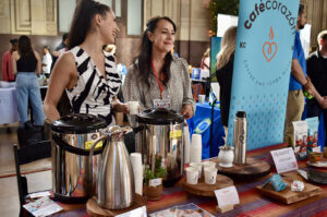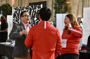 Joan Charbonneau, CEO of Perfect Promotions, center, networks at Union Station during the showcase event; photo by Nikki Overfelt Chifalu, Startland News