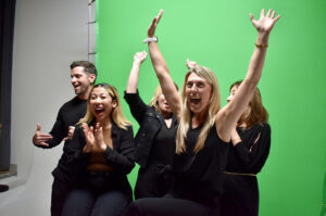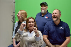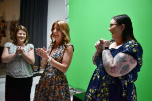 Kim Finley, president of Perfect Promotions, standing, and her team react to again being named to the Top 10 in the KC Chamber’s Small Business of the Year competition; photo by Nikki Overfelt Chifalu, Startland News