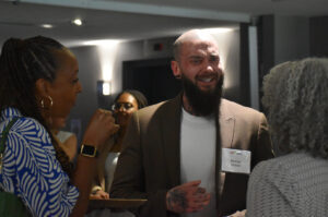 Clyde McQueen, Full Employment Council, speaks alongside Leigh Anne Taylor Knight, The DeBruce Foundation, during KC Rising’s Horizon event at Kauffman Stadium; photo by Taylor Wilmore, Startland News