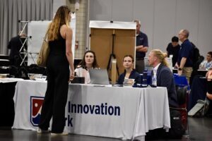 Craig Mason, founder of Kansas City-based Myndset, chats with the co-founders of Pet Portal AI during the BioKansas Startup Pitch Competition at Innovation Festival; photo by Nikki Overfelt Chifalu, Startland News