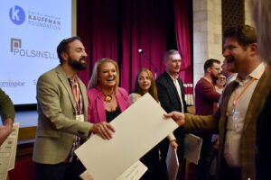 Entrepreneurship students award checks during the Pure Pitch Rally; photo by Nikki Overfelt Chifalu, Startland News