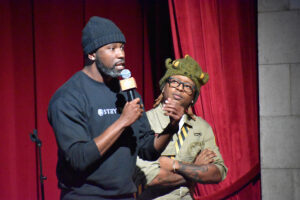 Herston Fails and JQ Sirls, StoryTailor, on stage at the Pure Pitch Rally; photo by Nikki Overfelt Chifalu, Startland News