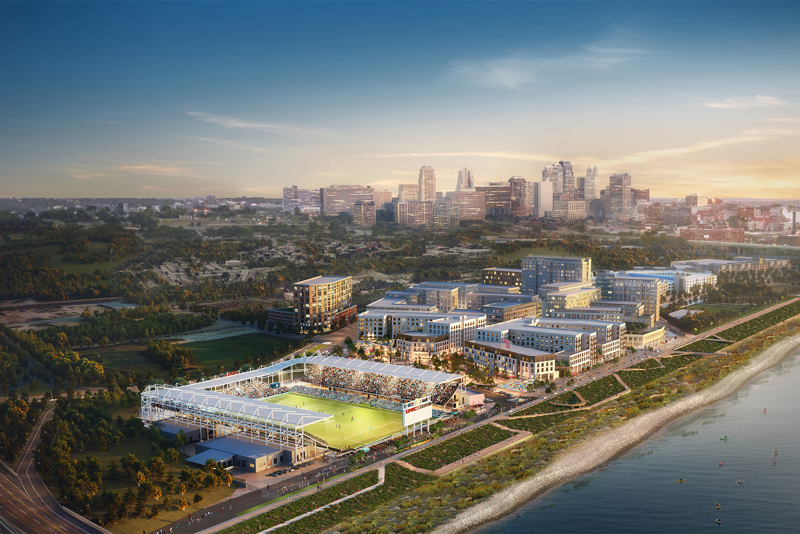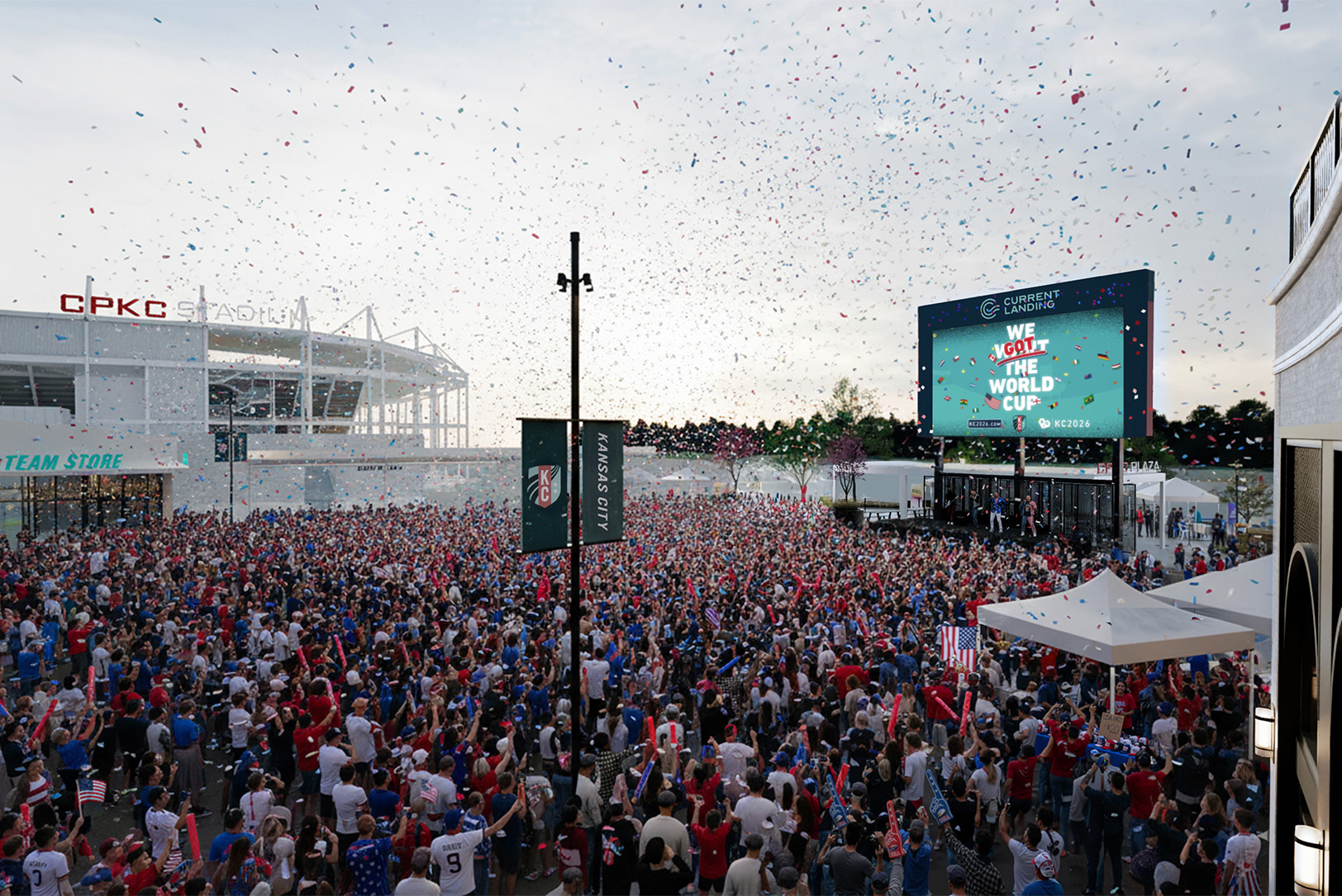 Anchored by CPKC Stadium and the Missouri River, Current Landing is set to feature “a dynamic blend of elevated waterfront residential living, best-in-class dining, one-of-a-kind sports and community entertainment, and irreplaceable riverfront gathering spaces designed to transform the fan and community experience year-round.”
