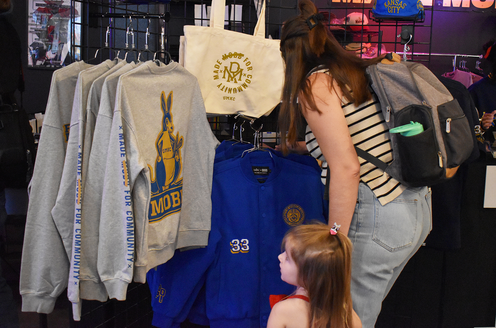 A shopper checks out an exclusive MADE MOBB apparel collaboration with UMKC during a September 2024 drop party event at the store; photo by Taylor Wilmore, Startland News