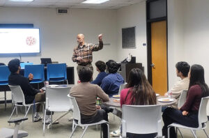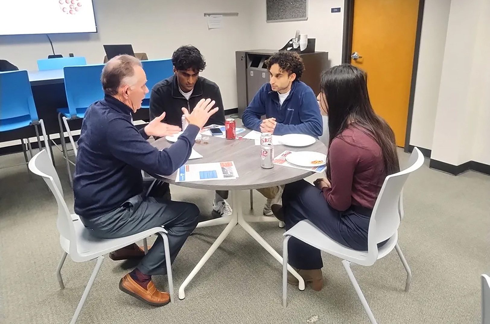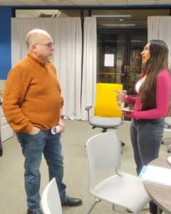 UMKC Bloch School Assistant Teaching Professor Mike Farmer discusses the RooLink Digital Health Sprint with the Kairos, Geometry Neuroscience, and Cyclea teams; photo by Pete Dulin, Tech Venture Studio