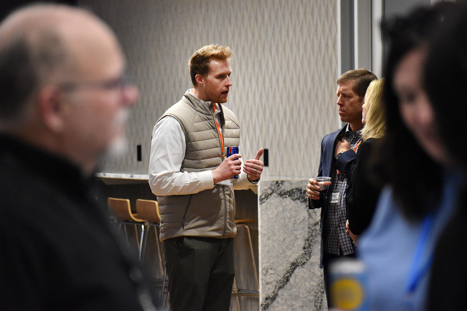 Nick Love, co-founder of Love Lifesciences, chats with fellow attendees at a January Pipeline Entrepreneurs Happy Hour meetup at Busey Bank in Kansas City; photo by Tommy Felts, Startland News