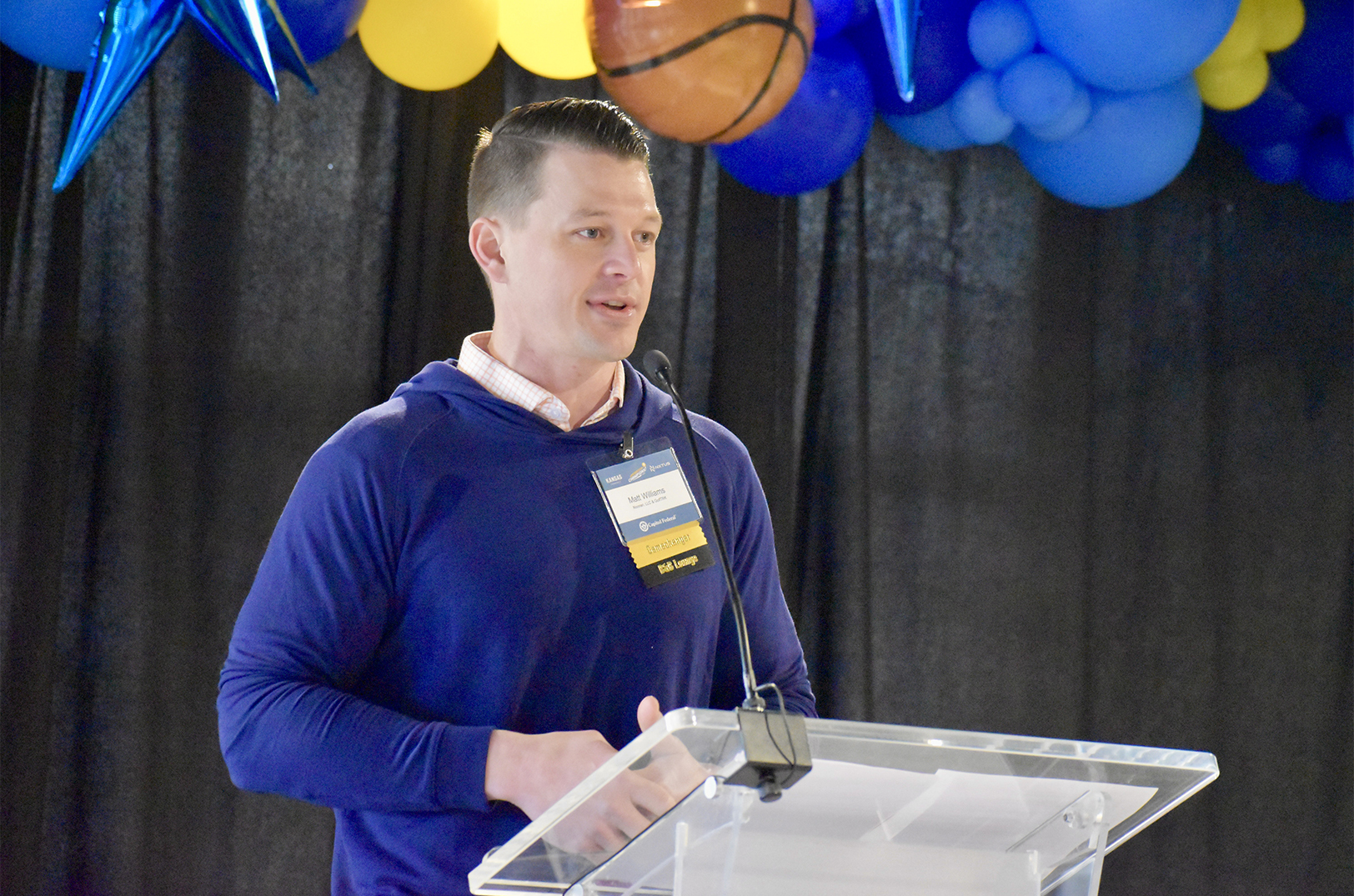 Gamechangers & Champions attendees participate in a basketball-themed lounge at the event, organized with a backdrop of the NCCA Mens Basketball Tournament in Wichita; photo by Nikki Overfelt Chifalu, Startland News