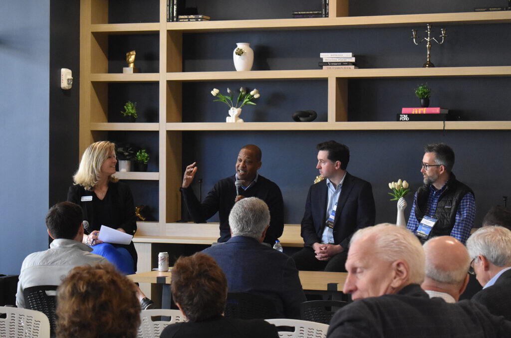 Mary Beth Jarvis, president and CEO of Wichita-based NXTUS, leads a Gamechangers & Champions panel conversation in 2025 with Kevin Lockett, Fulcrum Global Capital; Dan Kerr, Flyover Capital; and Josh Oeding, Tenzing Capital; photo by Taylor Wilmore, Startland News