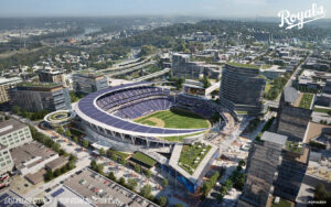 A 2023 rendering shows an aerial view of a proposed Royals baseball stadium if it were located in Kansas City’s East Village; rendering courtesy of the Kansas City Royals, Populous