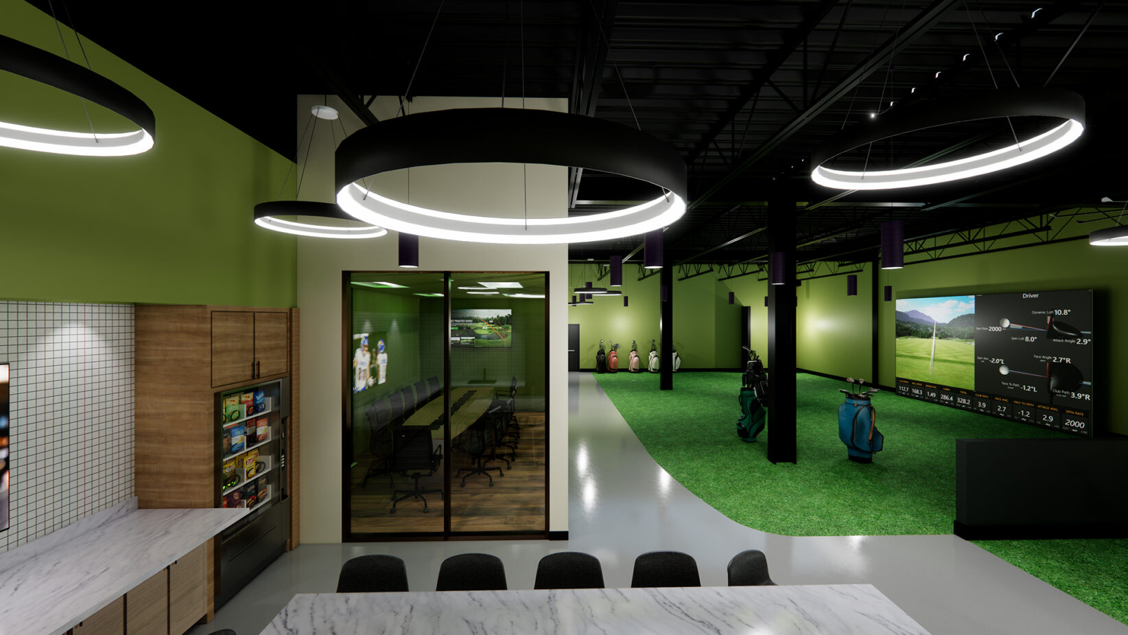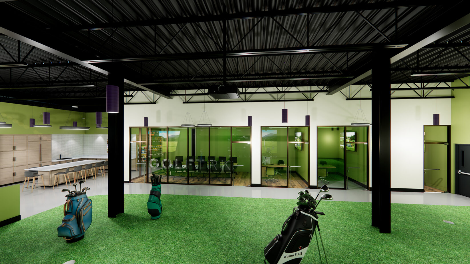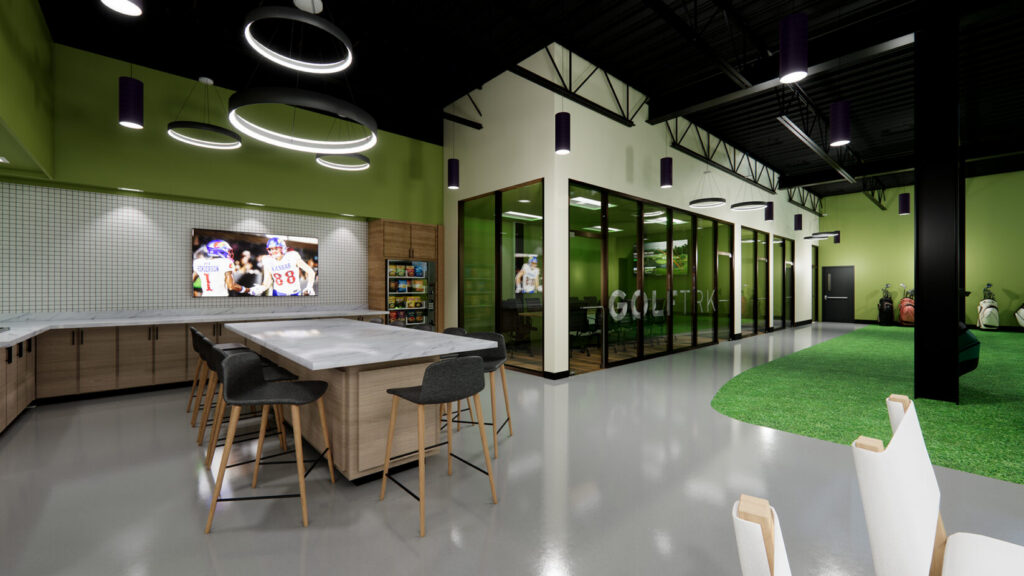 A rendering of a kitchen and bar area that transitions into office spaces and golf bays at Albatross Golf; rendering courtesy of GolfTRK