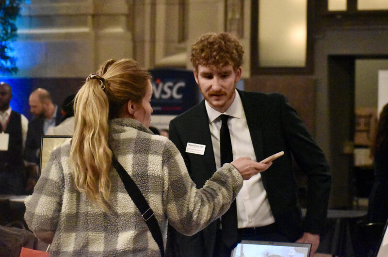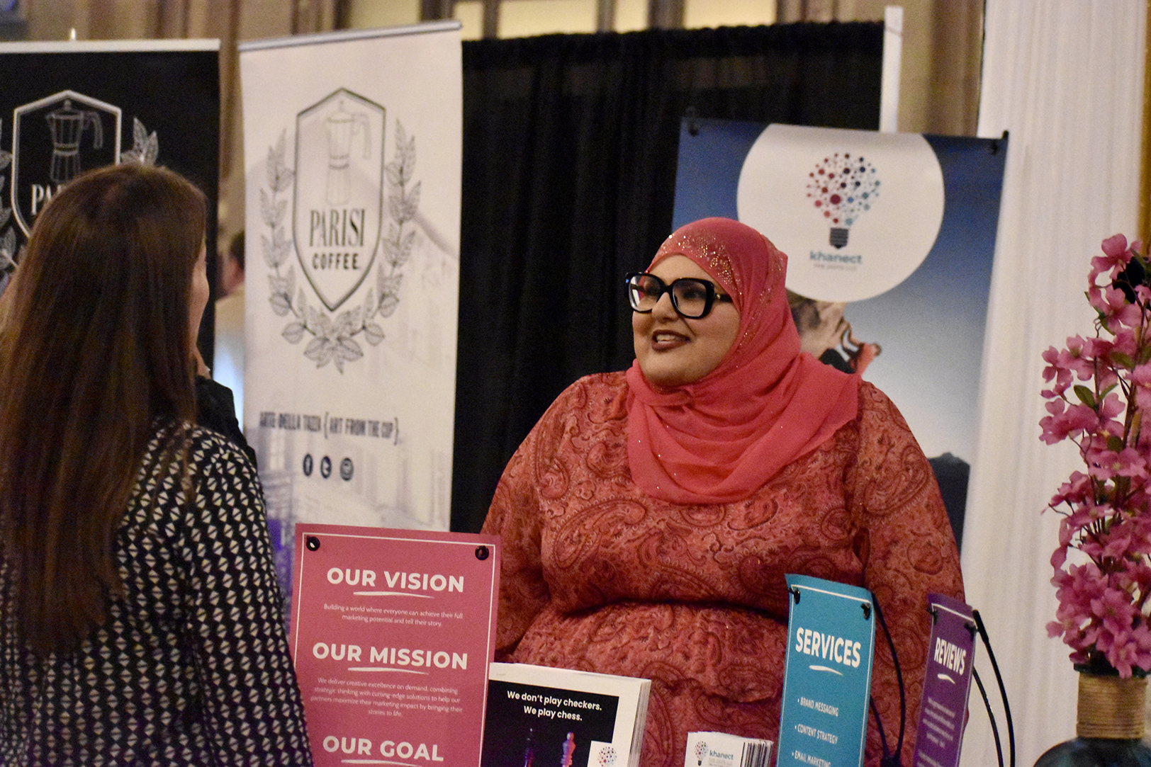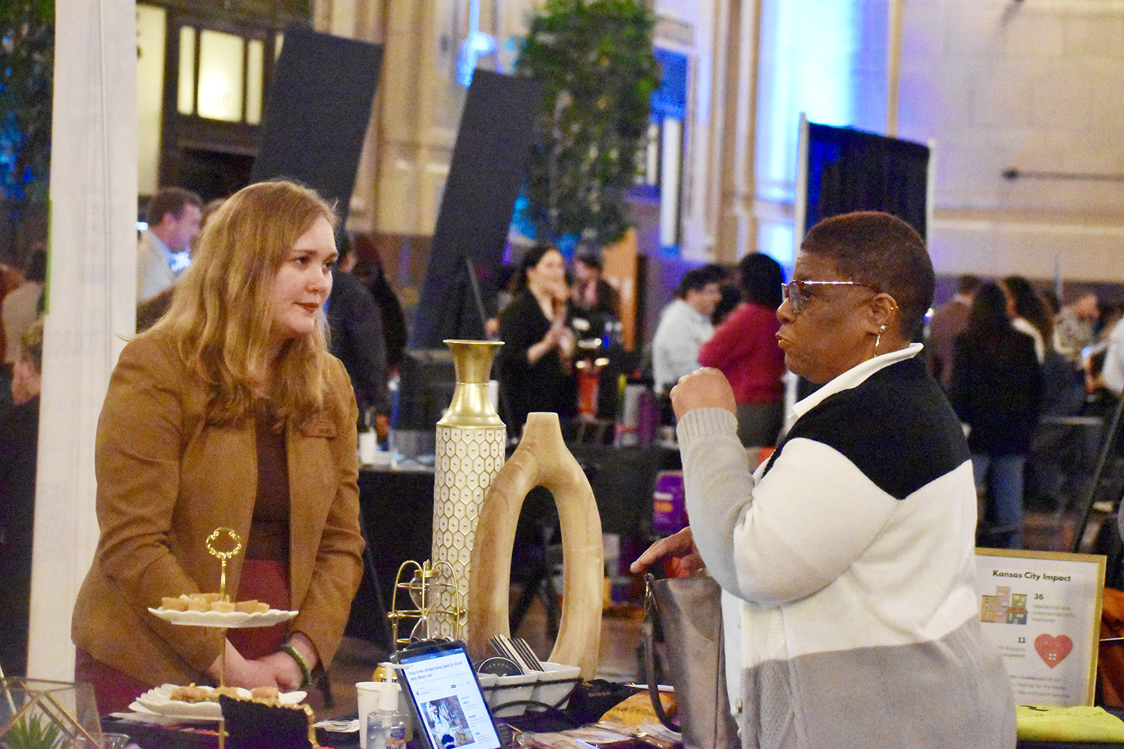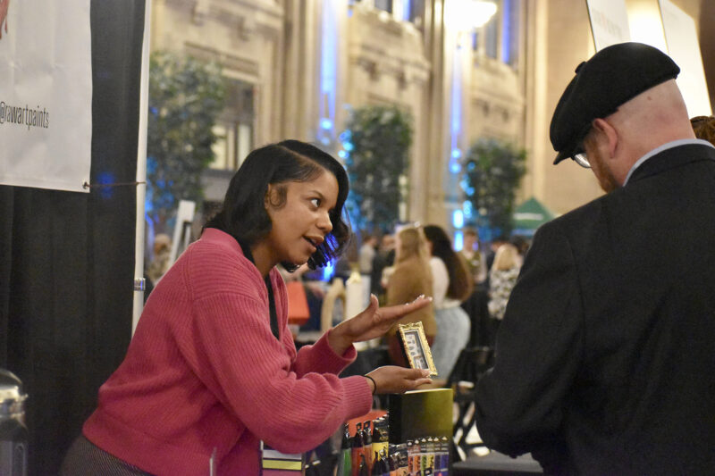 Maliha Khan, founder and CEO of Khanect the Dots and Khancepts by KTD, discusses her ventures with attendees at the KC Chamber’s Small Business Candidates Showcase at Union Station; photo by Nikki Overfelt Chifalu, Startland News