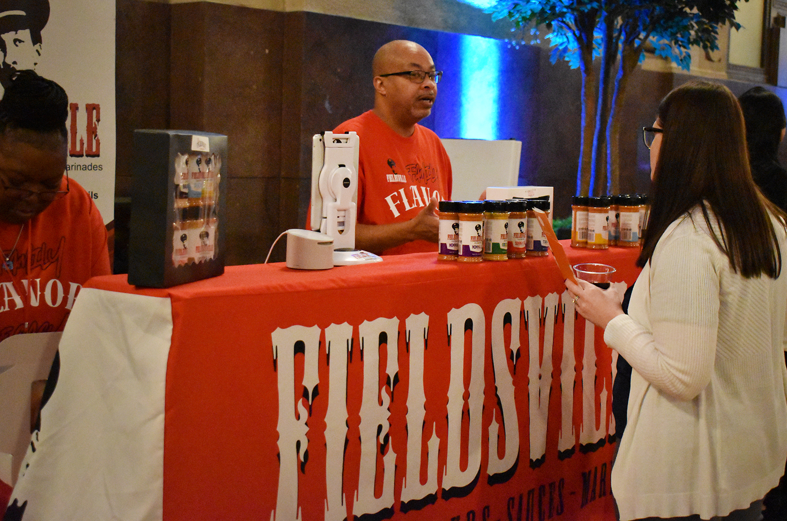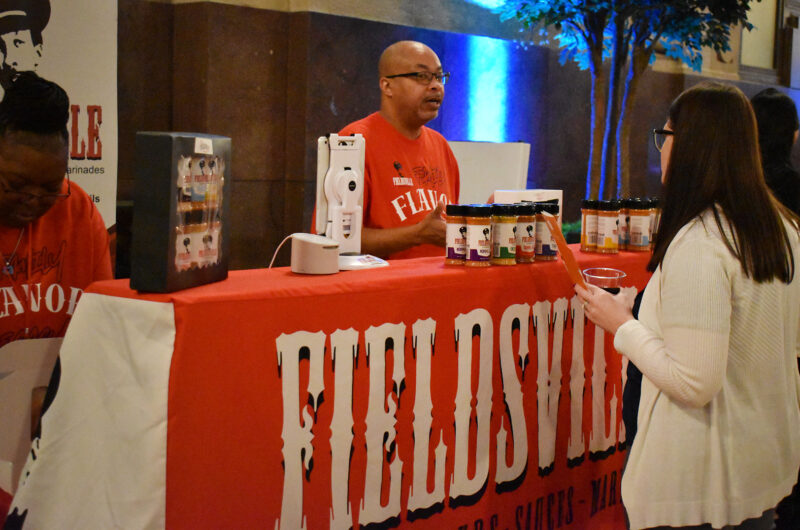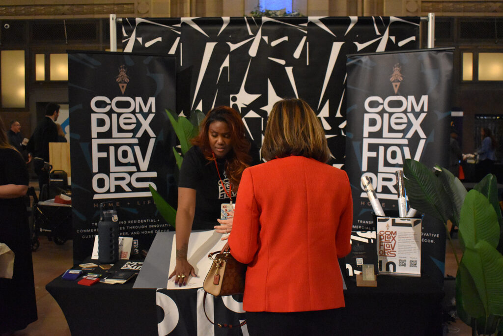 Founder Keisha Jordan walks a showcase visitor through product offerings from Complex Flavors; photo by Taylor Wilmore, Startland News