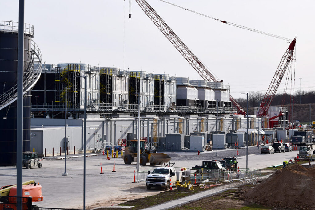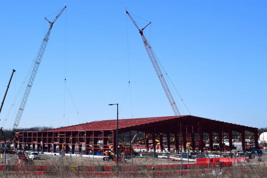 Three cranes frame a massive steel structure going up at Meta’s data center campus in Kansas City’s Northland, which drew an average of 1,500 skilled trade workers at its peak; photo by Thomas White, The Beacon